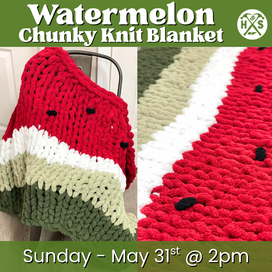 Join us Sunday, May 31st @ 2pm at Hammer & Stain-Mount Juliet for an ALL NEW BLANKET PATTERN! You won't want to miss your change to make one of our hand-knitted cozy blankets! The Watermelon blanket will measure approximately 40”x 60”. You will pick your yarn colors at the workshop. Seats are limited, so reserve your spot today! Registration for this workshop will close when all seats have been filled.