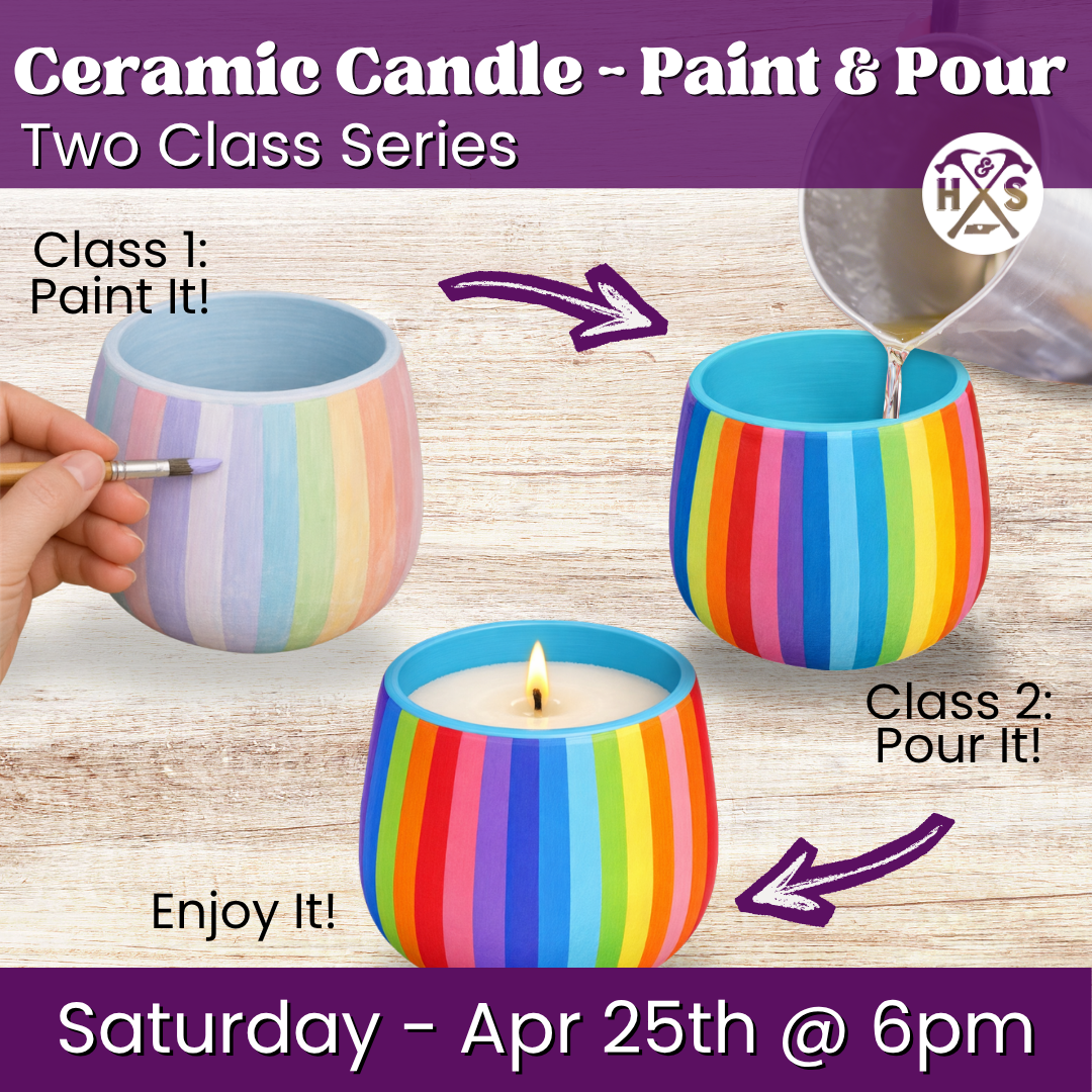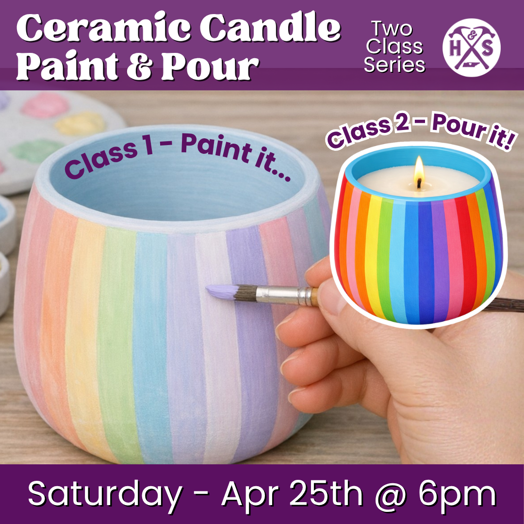 Join us on Saturday, April 25th at 6pm for an unforgettable ceramic painting experience. In this first class, you'll paint your own ceramic candle vessel, choosing from our wide selection of ceramic paint colors with hands-on guidance from our lead artisan. Your painted vessel will be fired in the kiln and ready for you to fill with your custom scented candle in Class 2 on Friday, May 8th at 6pm. This exclusive two-part series has limited seating, so grab your spot now!