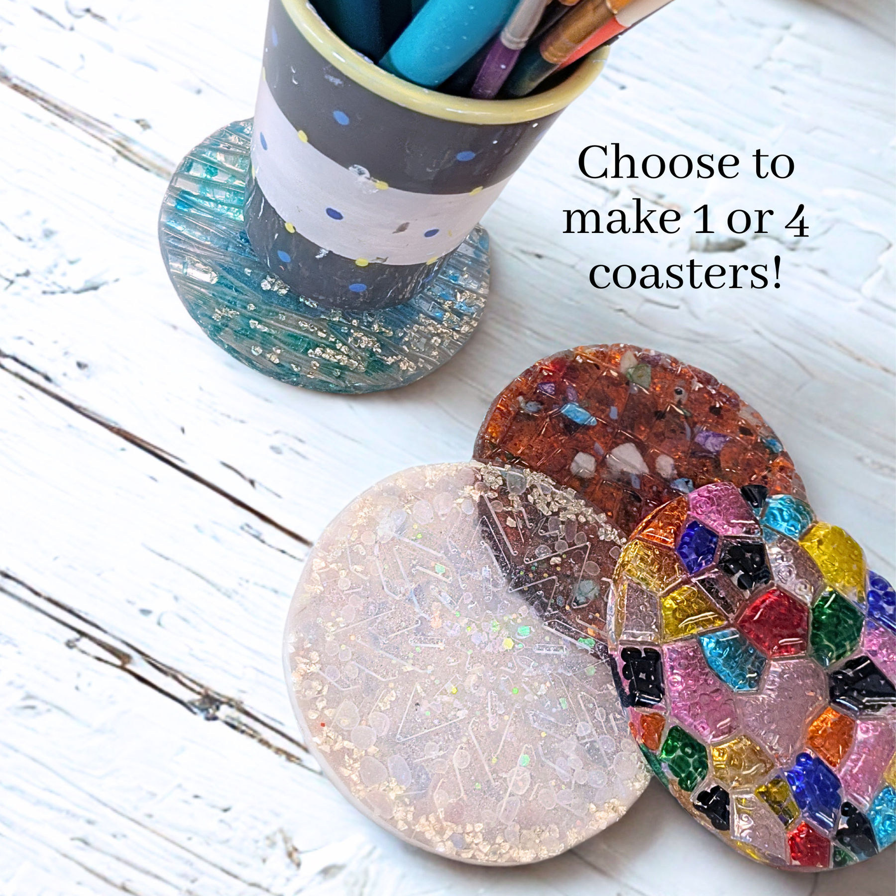 We will have coaster molds with textured designs as well as solid molds with no designs or textures. Select 1 coaster for $18 or 4 for $55.