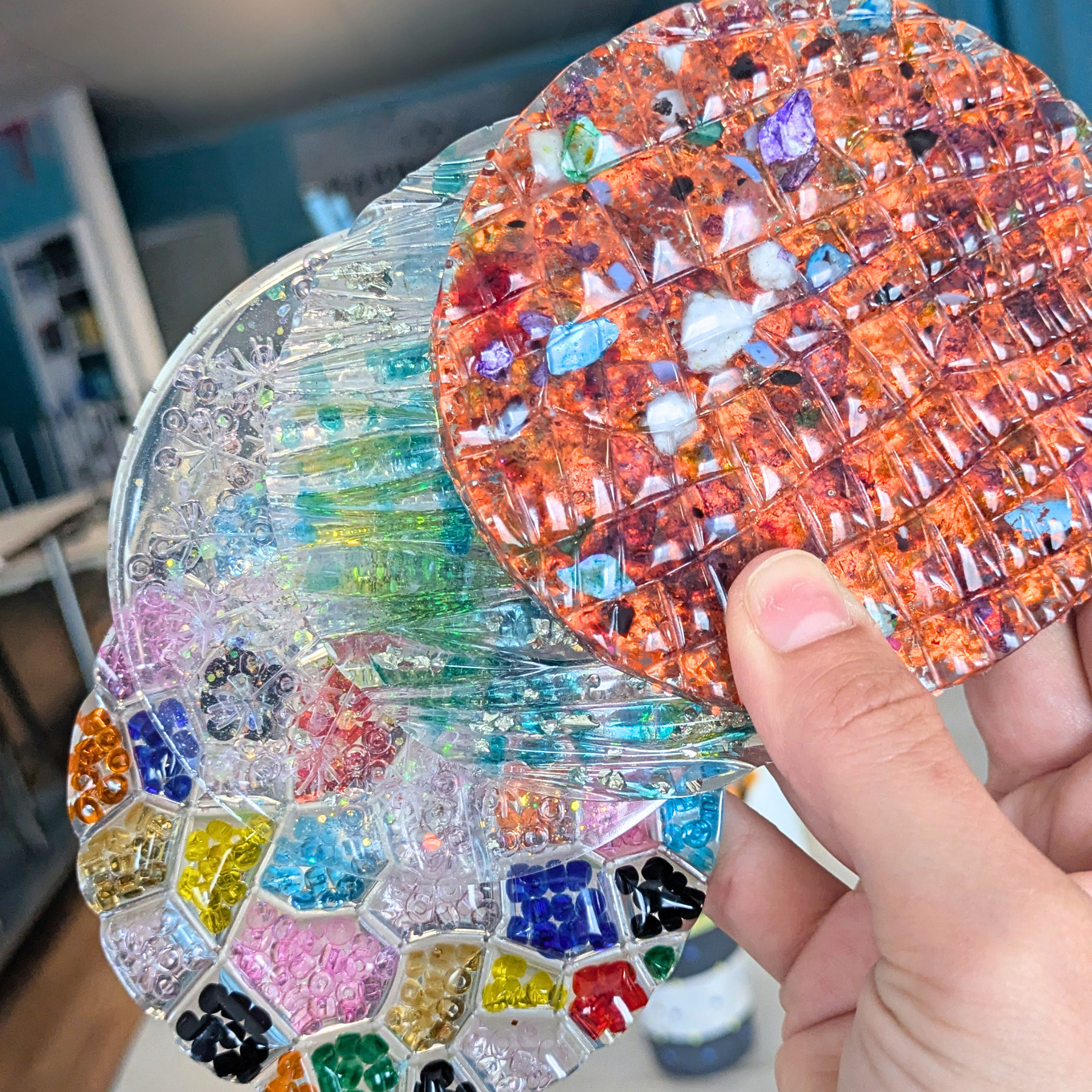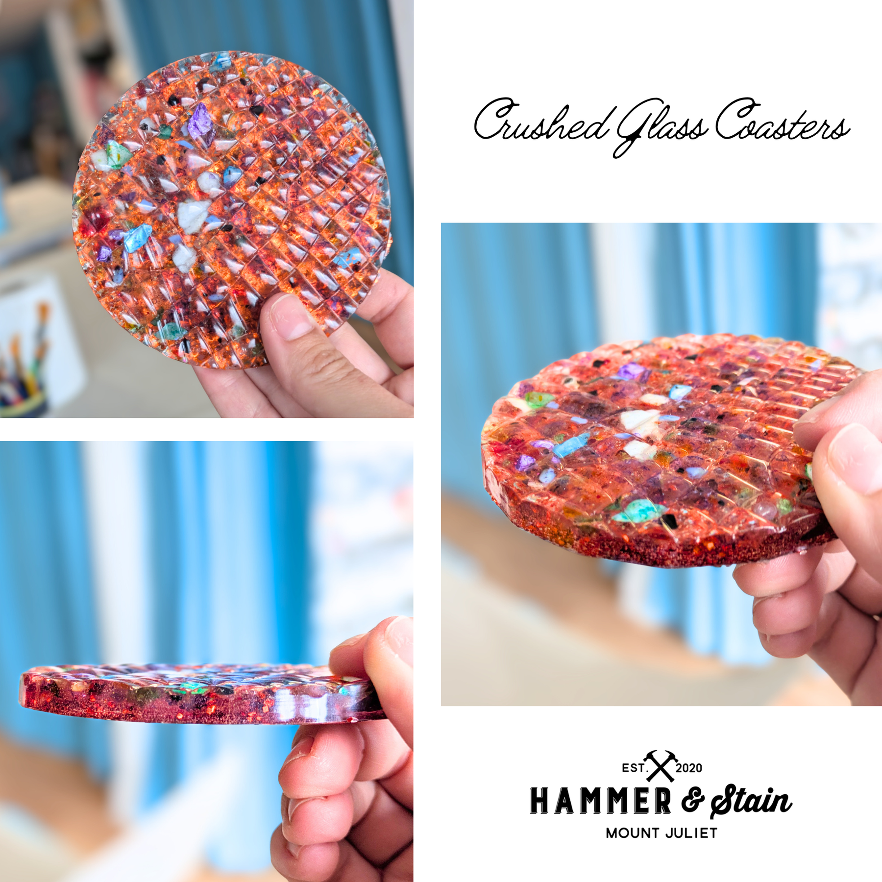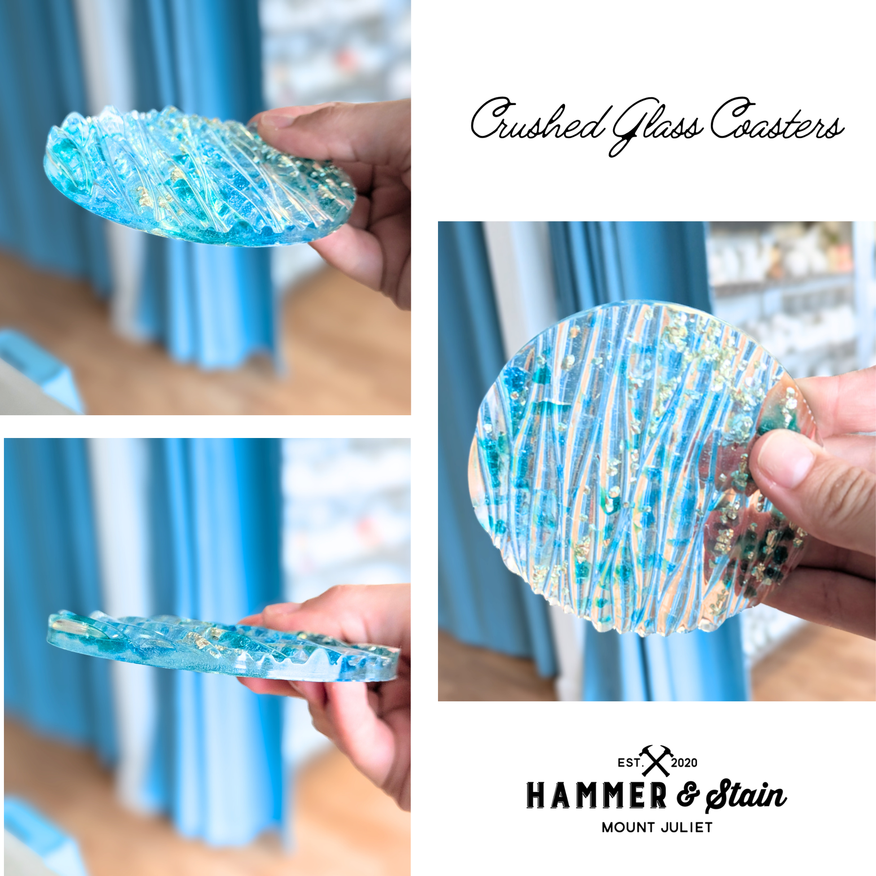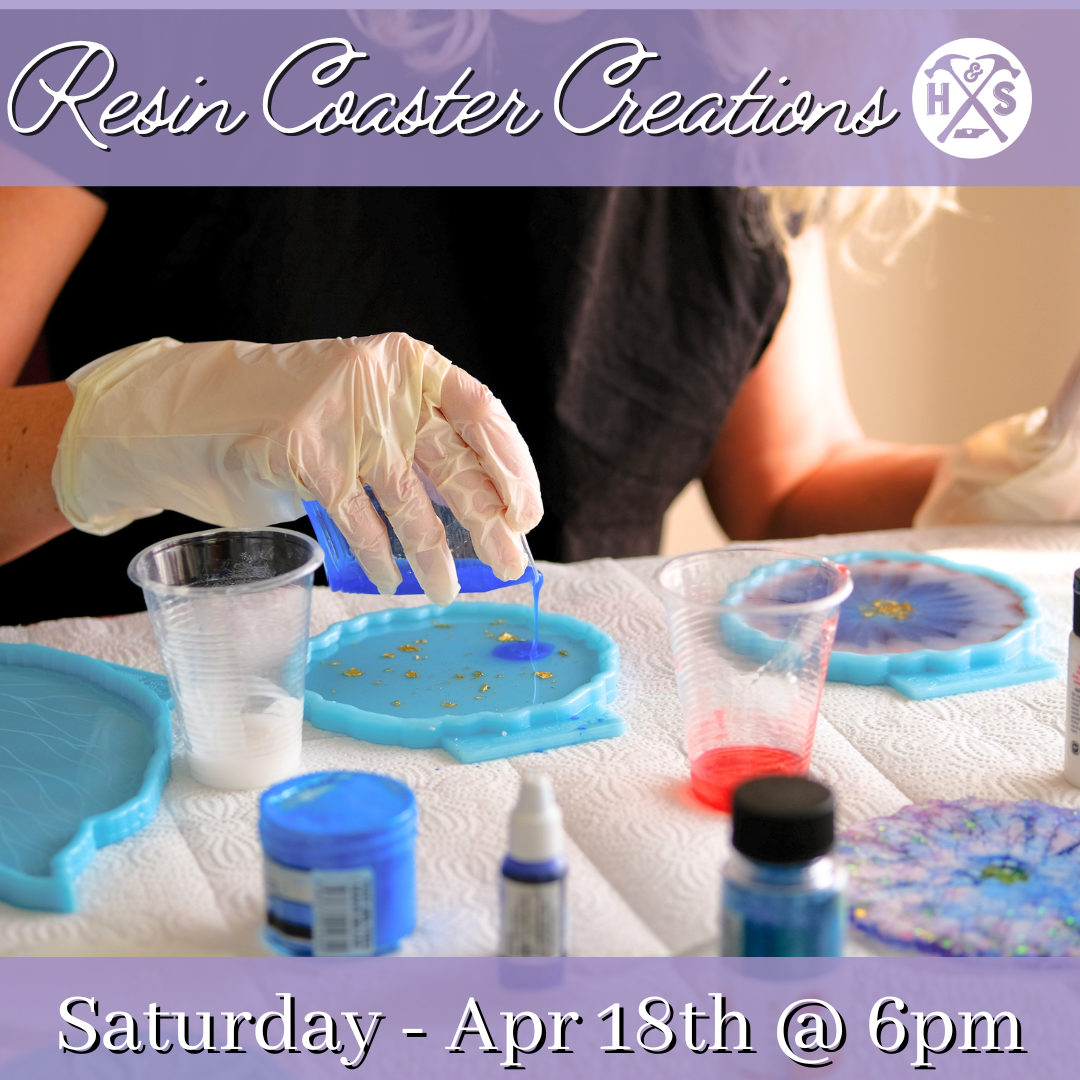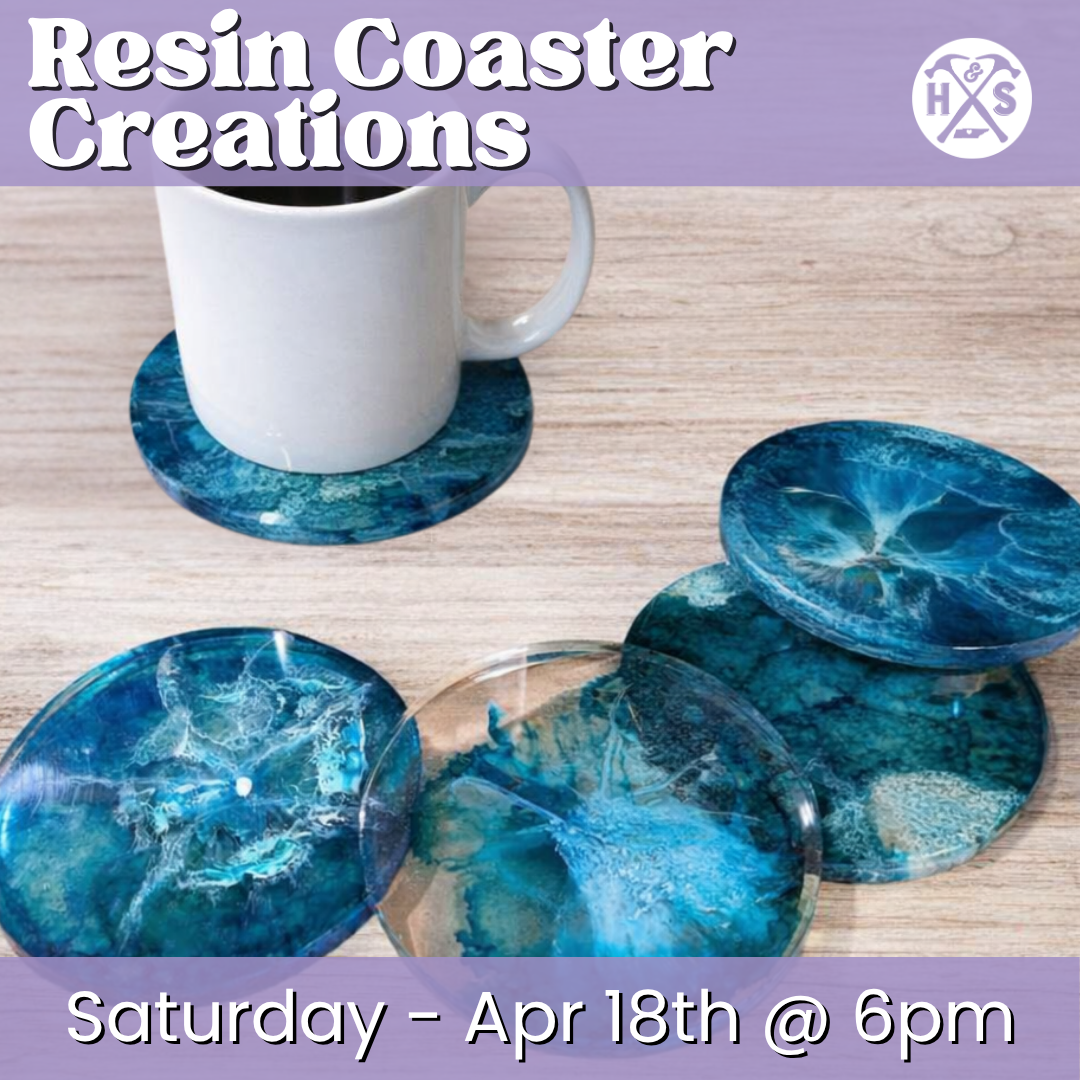 Watch crushed glass, pressed flowers, or bright colors transform into glittering art as it meets resin—creating coasters that catch the light and turn heads every time! Create your own stunning resin coasters in this hands-on art class on Saturday, April 18th @ 6pm! Perfect for beginners or anyone who loved our framed crushed glass creations class and wants to explore the technique in a new way. Choose your own colors and designs and take home a beautiful, functional piece.