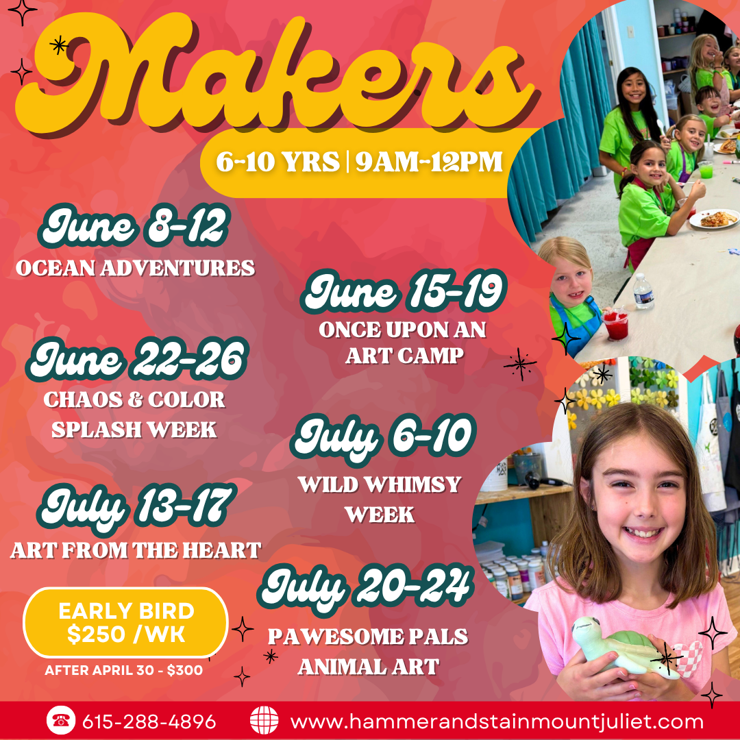 IT'S HERE!!! We are SO excited to offer our Summer Art Camp for Kids 2026.  Our Morning Session from 9am-12pm is for our "MAKERS" ages 6-10 years old!